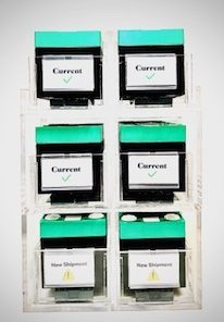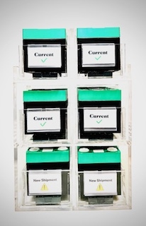 - 3-tier shelving design customized to hold (4) standard reagent pack containers and (2) multiplier reagent pack containers topside.